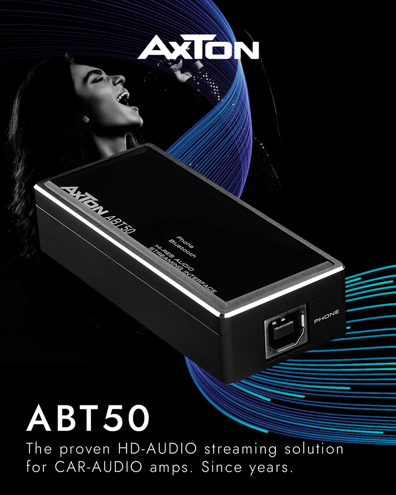 • Αξεσουάρ υψηλής τεχνολογίας για τους ενισχυτές AXTON A542DSP και A592DSP: Με τη διεπαφή ροής ήχου ATB50, τα αρχεία ήχου Hi-Res – και φυσικά όλα τα συμβατικά δεδομένα μουσικής – μπορούν να αναπαραχθούν μέσω Bluetooth με το πρότυπο APTX-HD μέσω του ηχοσυστήματος αυτοκινήτου . Απλώς συνδέστε τη μονάδα ροής ABT50 στο A542DSP ή A592DSP και απολαύστε την αγαπημένη σας μουσική στην καλύτερη ανάλυση ήχου.