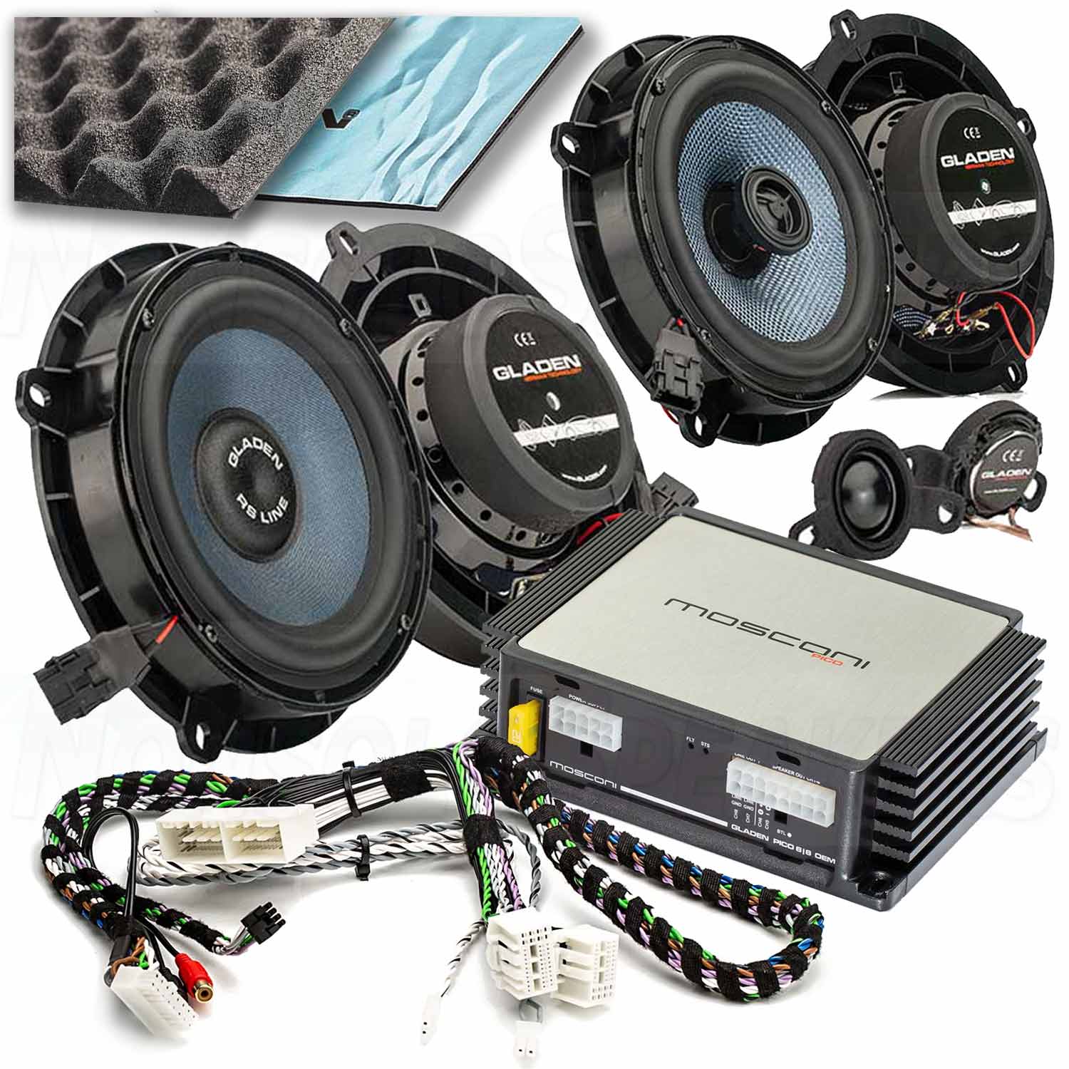The SoundUp package includes a 16 cm passive front speaker system incl. installation adapter, a pair of 2-way coaxial speakers incl. installation adapter, a 6 channel DSP amplifier, a vehicle-specific plug & play harness set and damping material to prevent vibration of the speaker installation locations.